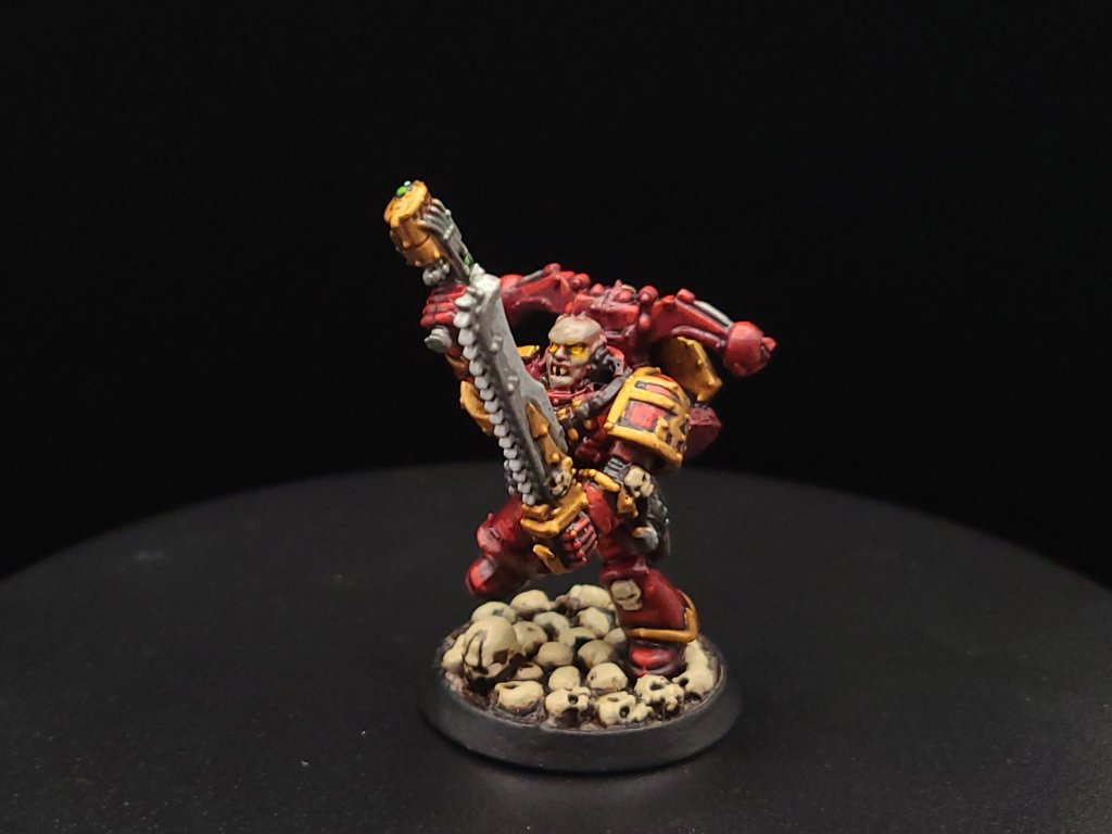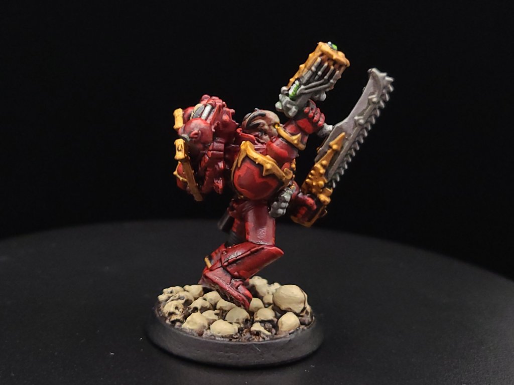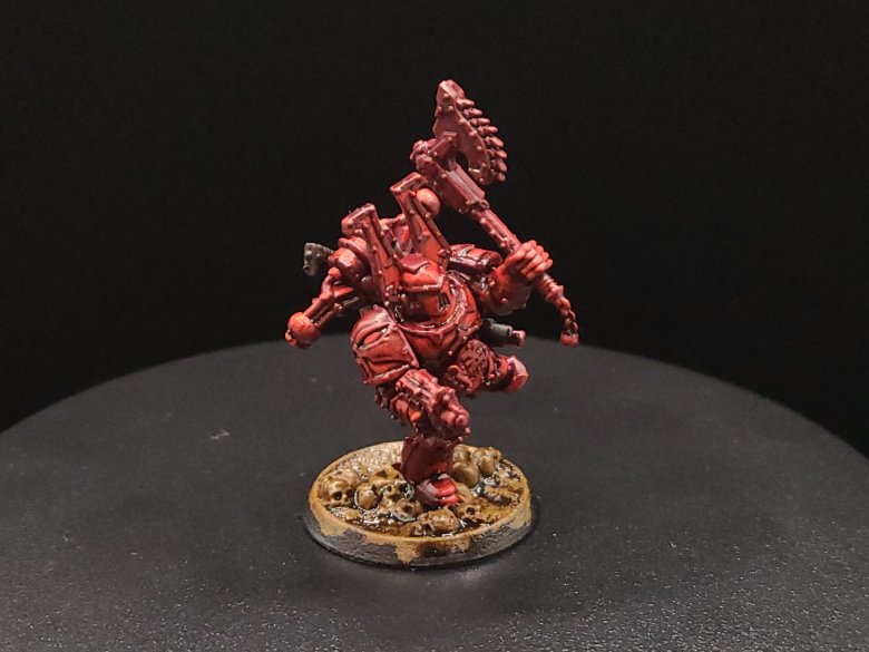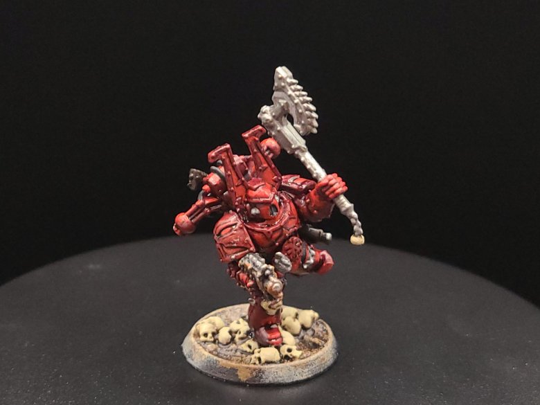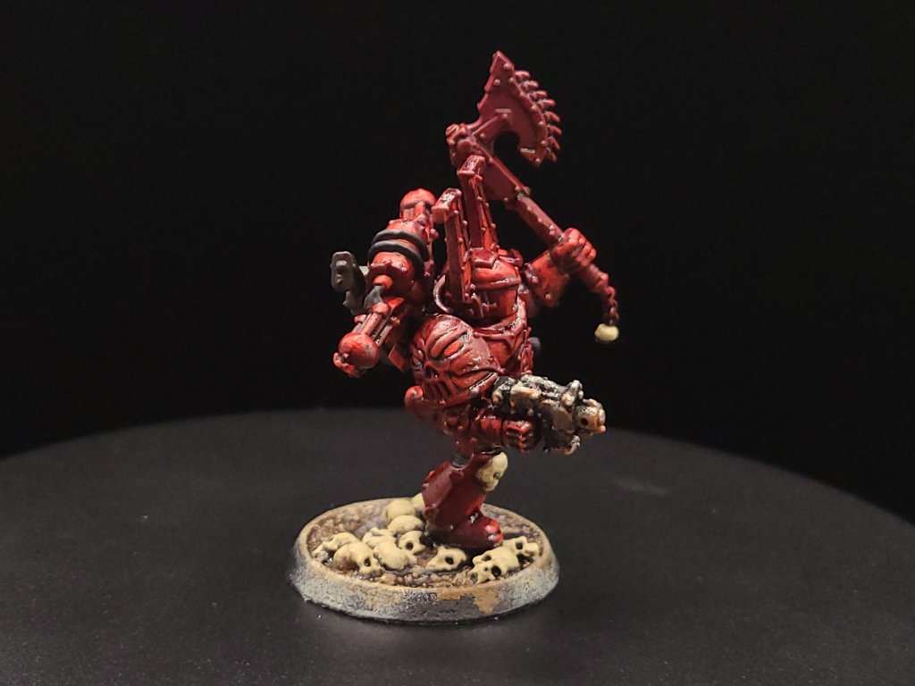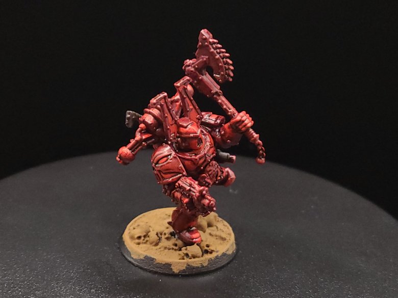 And that, start to finish, is how we turn our little dude from an unpainted gray plastic miniature to a finished Khorne Berzerker! If this goes well between the online stuff and the convention circuit, I hope to also have some tutorials done for other Chaos factions and for Aeldari, which is my personal favorite faction in the game. If you have any questions for me about the tutorial feel free to reach out to me in the comments below, or on Instagram under the handle twitchybristles, where I also post a lot of the miniatures that I paint in my spare time. Thanks again to SmashleyDraws for some of the graphics!