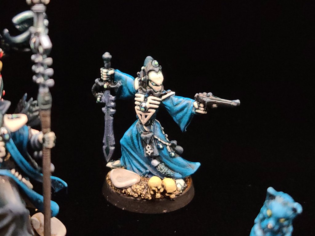 Let’s get weird with this! The initial cluster of characters I painted for my Aeldari 10th Edition army include a Farseer, a couple of Warlocks, and a Spiritseer I repainted and re-kitbashed, but closer examination reveals a little bit of what I wanted to do with this army thematically. The butt end of the Farseer’s spear has been replaced with a Genestealer Cult icon borrowed from some Brood Brothers, and the Spiritseer’s staff sports the crown gem of a Magus’ staff. These elves are indeed very weird, and very Genestealer-y, and I’ve made sure that this will also be reflected in their Battle Tokens, since the tokens are such an important part of playing Aeldari this edition.