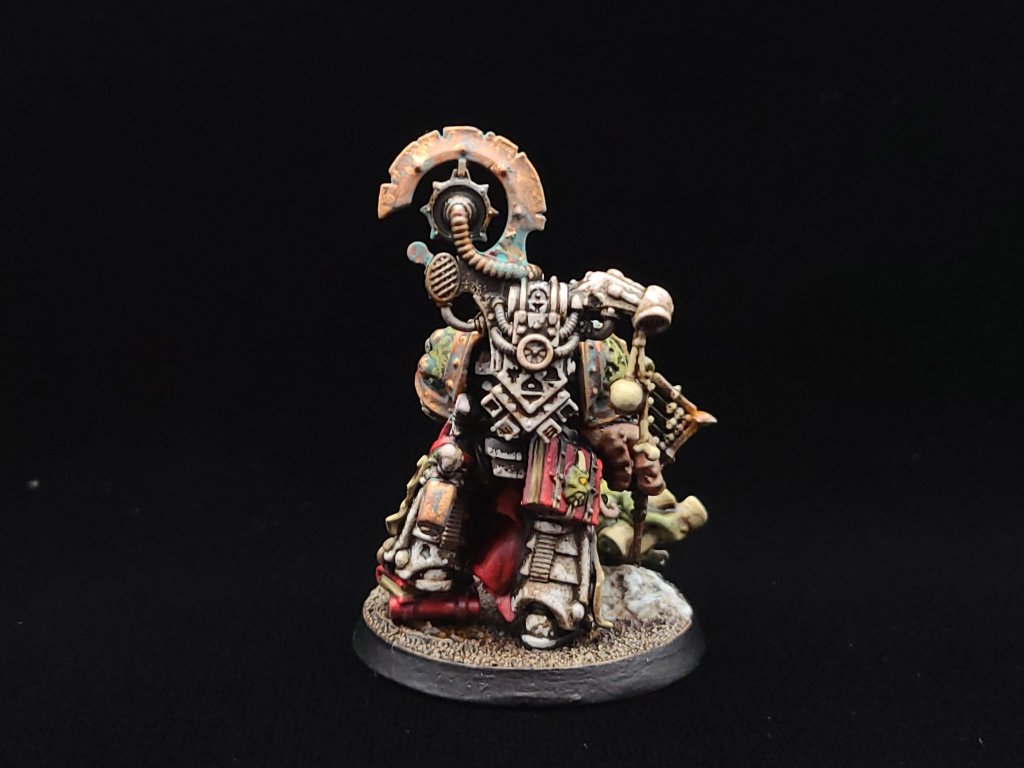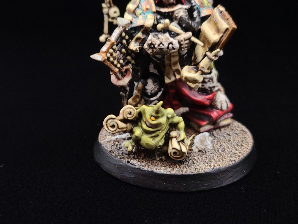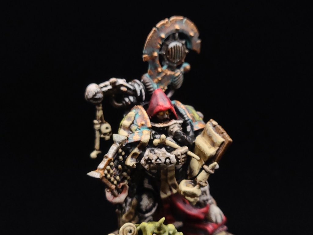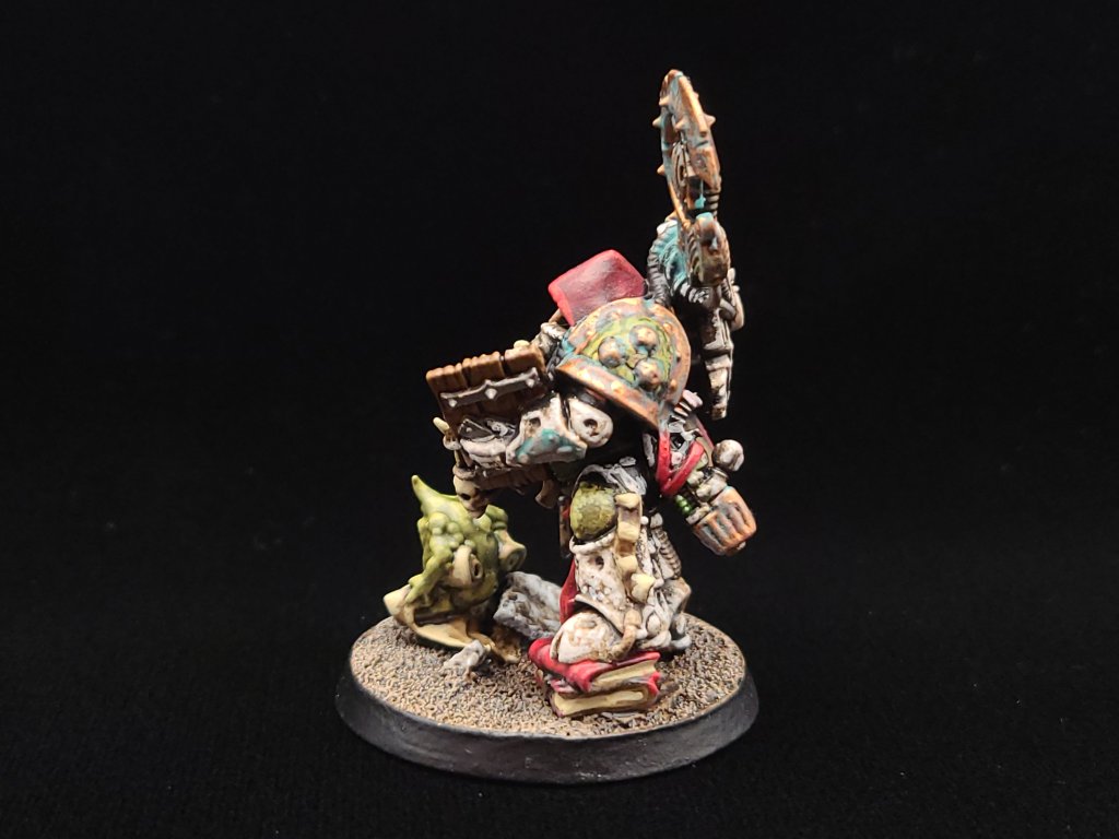 Given that my work for the last four year has directly involved income taxes, the Tallyman felt like a natural pick for a Death Guard model I was going to have to add to my army at some point. I like that this is just a model that’s packed with little details and flavor, from the abacus that he’s carrying via tentacle to the scroll, to the plasma pistol, to the tiny Nurgling carrying yet more scrolls. I also kind of like the hooked “microphone” piece on top, and especially once I applied my usual Death Guard metallics formula with Screaming Bell, Hashut Copper, and Nihilakh Oxide, I found this was a really nice standout detail on the model.