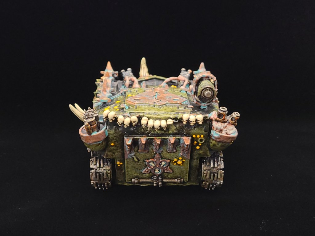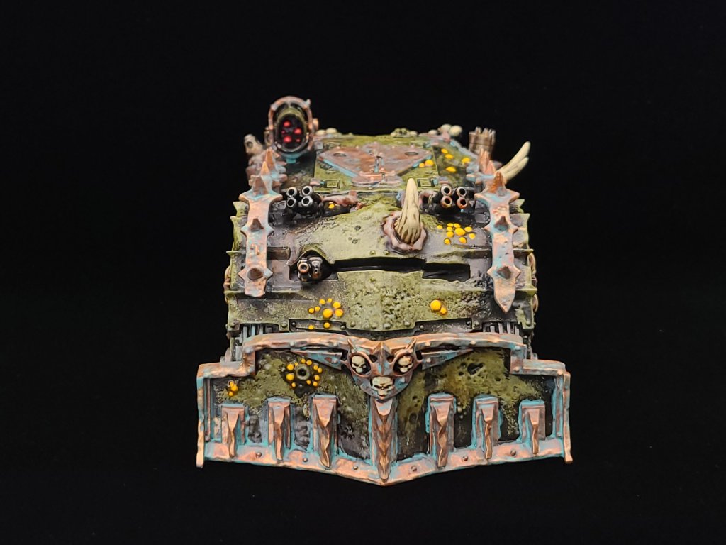 While paint on the Tallyman was drying, I started sponge coats and metallics on this old beast of a model, which Kinpatsusamurai got me last Christmas, and which has basically been sitting on the shame pile since. Since this and the Tallyman were the only Death Guard stuff I had in the paint queue I decided they were getting cleared at the same time. I’m not entirely sure what this one is! I think if I ever use it in a casual game it’ll be to proxy a Rhino, but since selling off some of my other terrain pieces earlier in the year I think it’s going to see even more action as a line-of-sight-blocking piece for upcoming games. I’ve got a few “ruins” pieces but it’ll be useful to have some real, blocky pieces that I can throw onto the table too. Very happy with how this one turned out, too!
