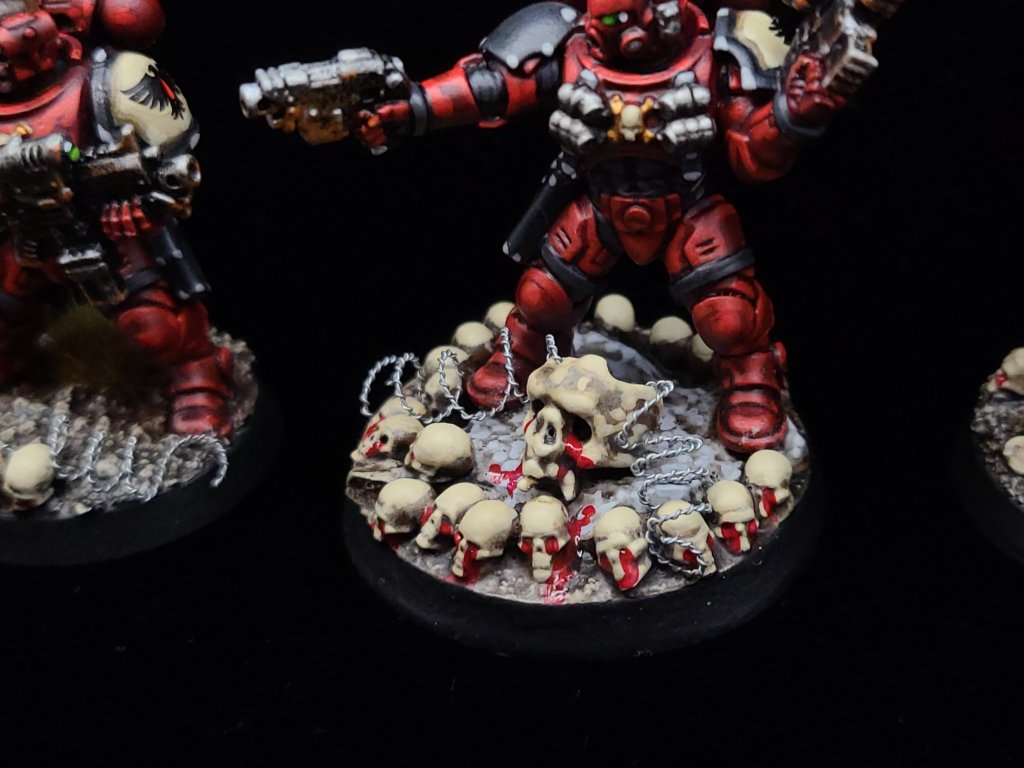 I followed the same recipe largely as with Martellus and with my previous test models, with the same abundance of inconspicuous blood and skulls on the basing. The barbed wire was an old Christmas gift from brittneystucklessart and I’ve been looking for an excuse to use it more, and I think it fits nicely with ragtag Space Marines. The tufts and blood effects came from the same gift box, I think it may have been from the Army Painter range. It really gets the job done though and looks great on these guys. I also added a bird friend for the squad leader, who I got as a resin piece from Green Stuff World – I’m branching out into their resin bits more and there’s some cool stuff here. I couldn’t resist giving my Blood Ravens an actual raven.
